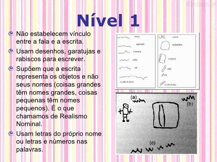 Cards explicativos com os níveis de escrita, segundo Emília Ferreiro...